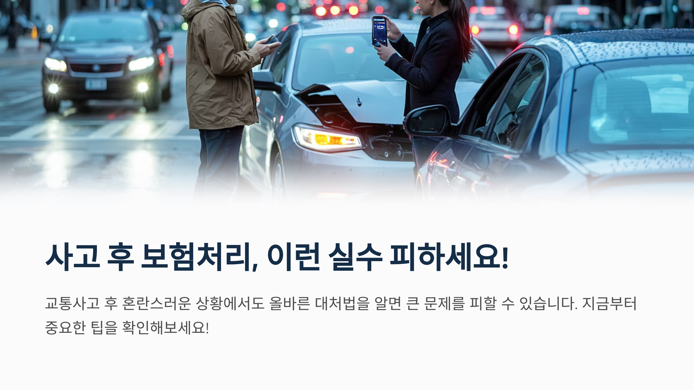 안녕하세요! 오늘은 교통사고 후 보험처리 과정에서 흔히 발생하는 실수들을 예방하는 방법에 대해 알아보겠습니다. 사고 후 혼란스러운 상황에서도 올바른 대처법을 알면 큰 문제를 피할 수 있습니다. 지금부터 함께 확인해 보세요!