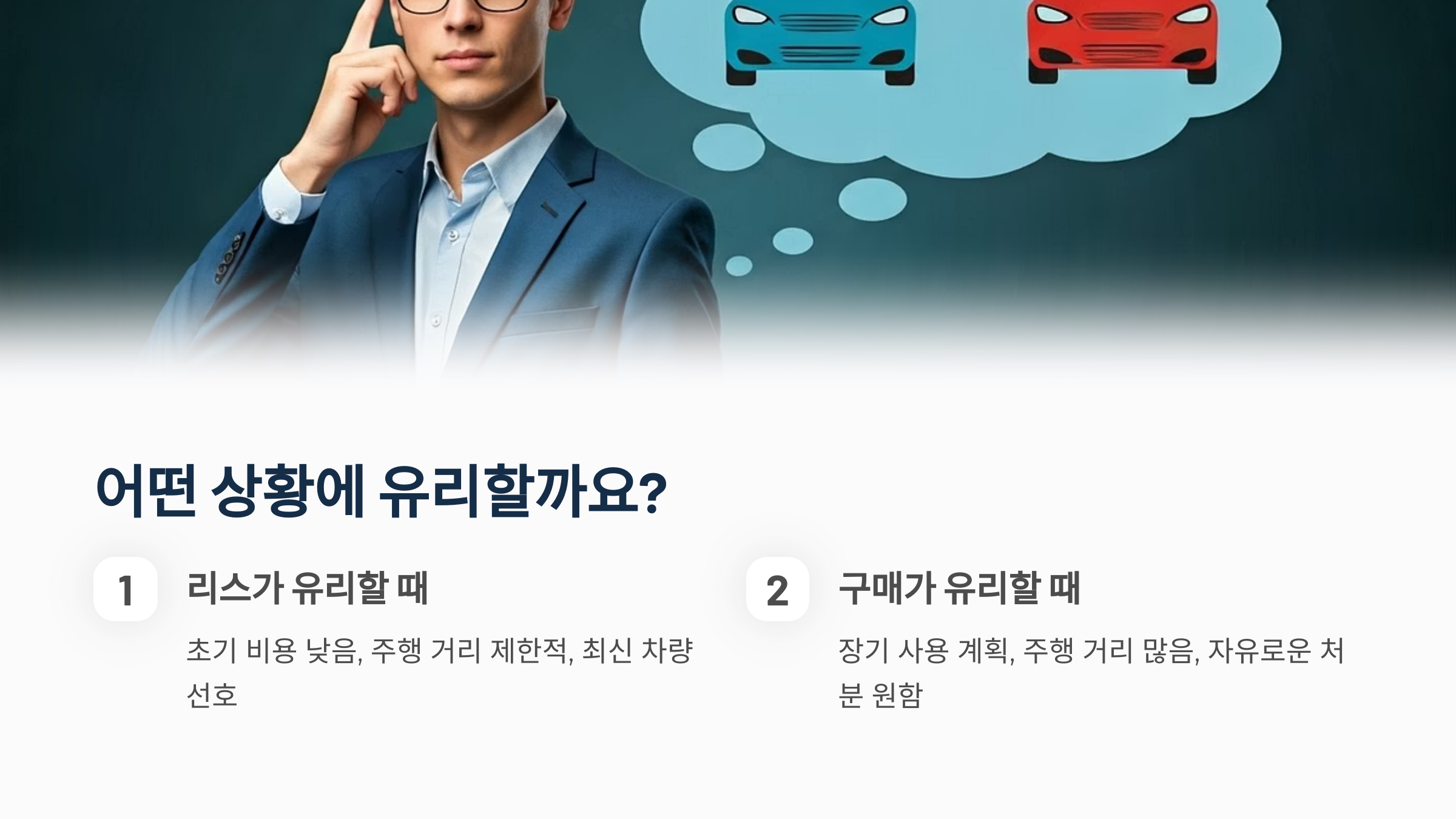 리스는 초기 비용이 낮고, 주행 거리가 제한적이며 차량 소유권이 필요하지 않을 때 유리합니다.