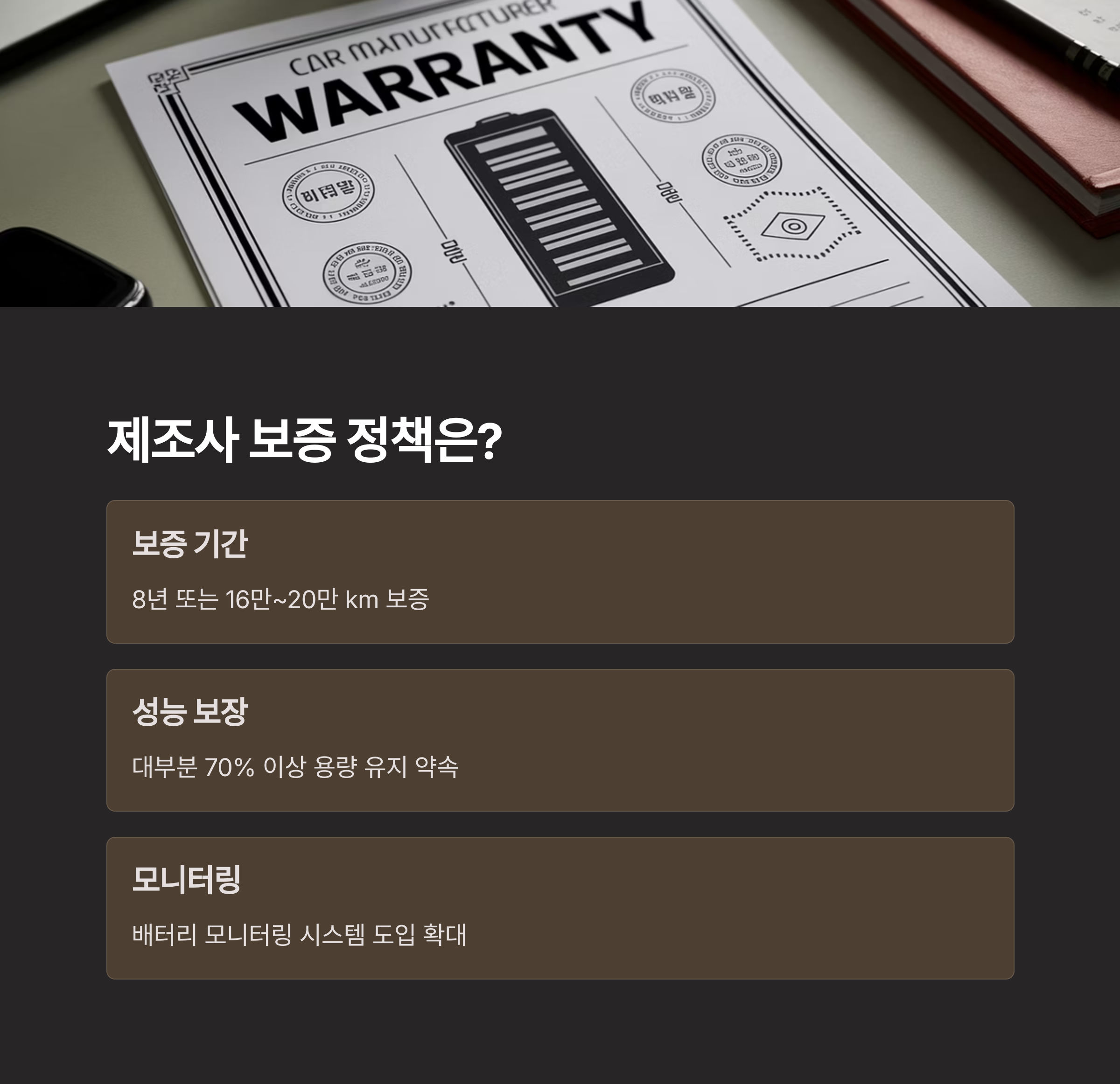 | 제조사/모델 | 보증 기간 | 보증 주행 거리 | 성능 유지 기준 |