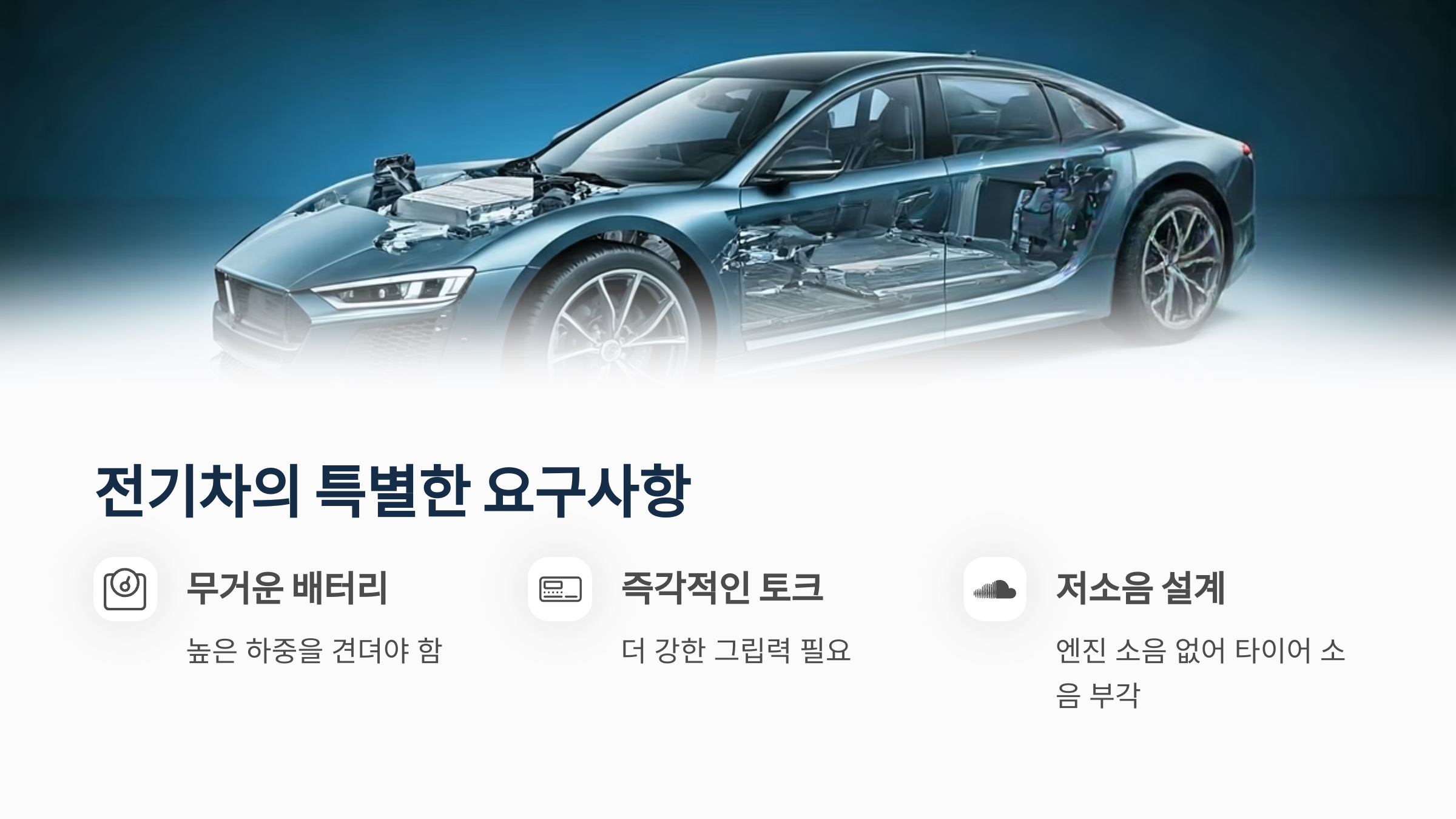 전기차는 일반 내연기관 차량과 달리 무거운 배터리로 인해 더 높은 하중을 견뎌야 합니다. 또한, 전기 모터의 즉각적인 토크와 동력 출력으로 인해 타이어의 그립력과 성능이 중요합니다. 엔진 소음이 없는 전기차에서는 타이어 소음이 더욱 부각되므로 저소음 설계도 필수적입니다.