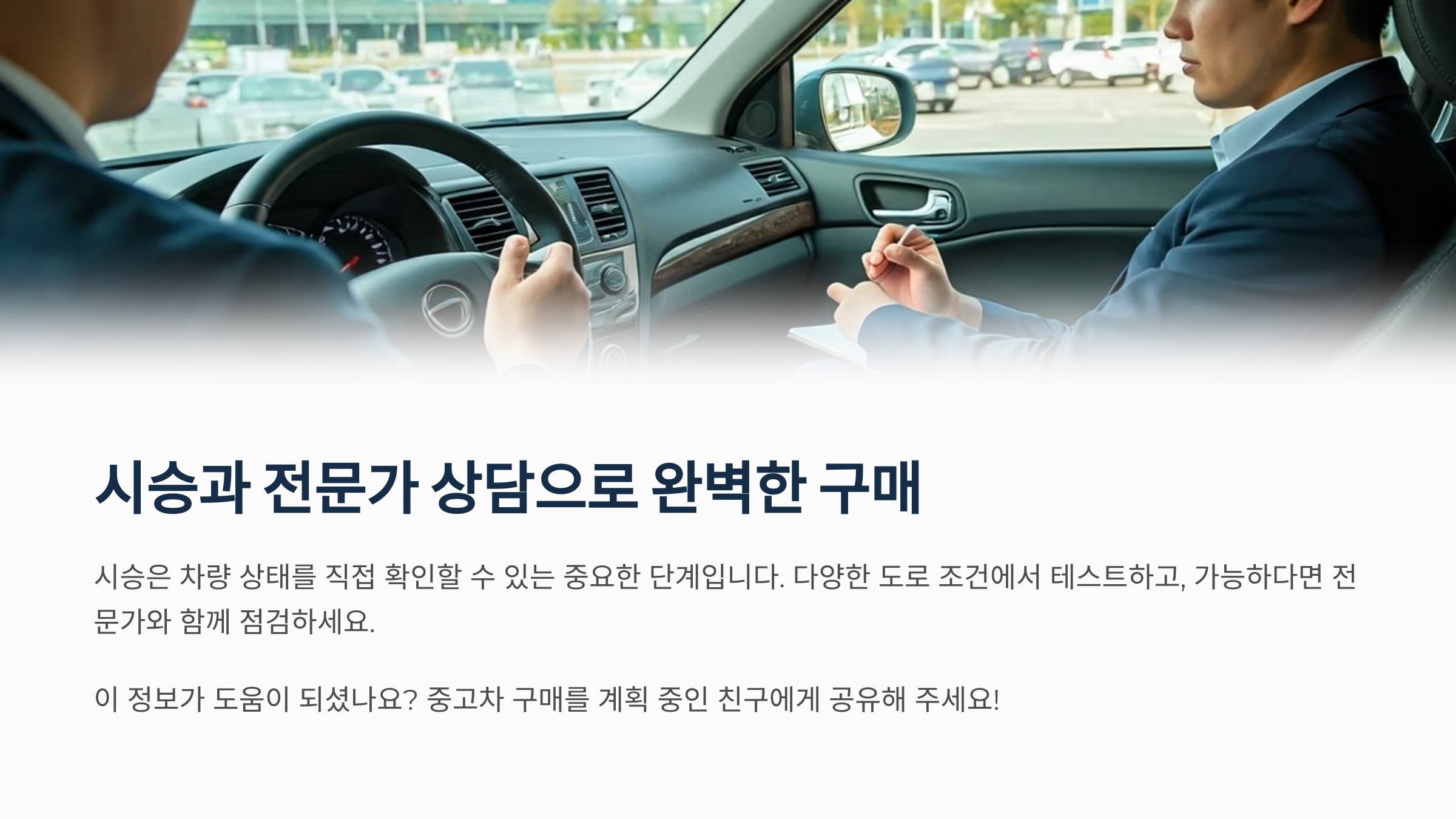 중고차 구매는 꼼꼼한 점검과 준비가 핵심입니다. 예산 설정, 차량 상태 점검, 시승 테스트를 통해 실수를 줄이고, 전문가의 도움을 받아 만족스러운 구매를 하시길 바랍니다. 안전하고 현명한 선택이 되시길 응원합니다!
