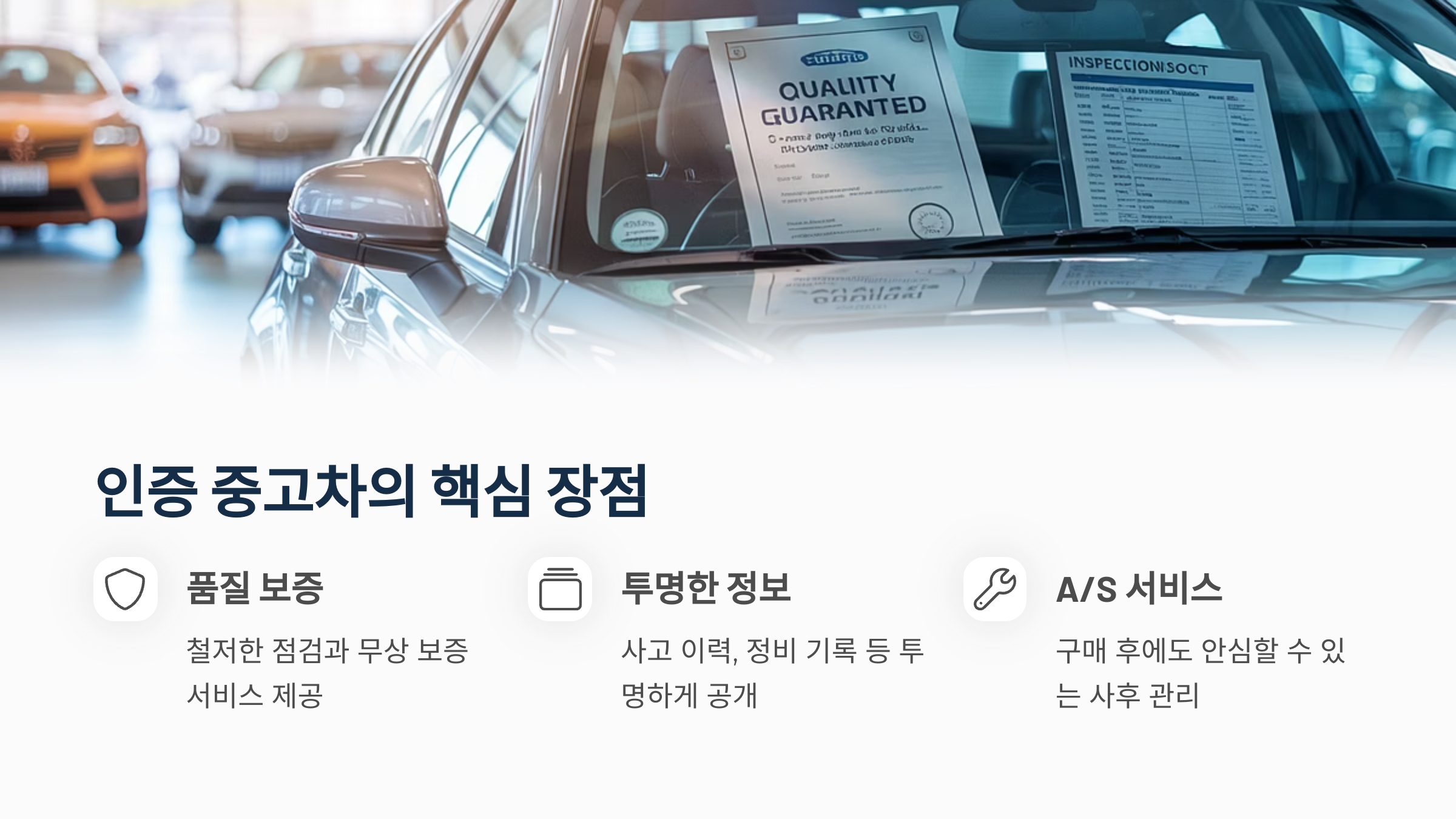 중고차 인증 시스템은 구매자에게 품질 보증과 신뢰성을 제공합니다. 차량의 사고 이력, 정비 이력 등 중요한 정보를 투명하게 공개하며, 무상 보증 및 A/S 서비스도 포함되어 있어 구매 후에도 안심할 수 있습니다.