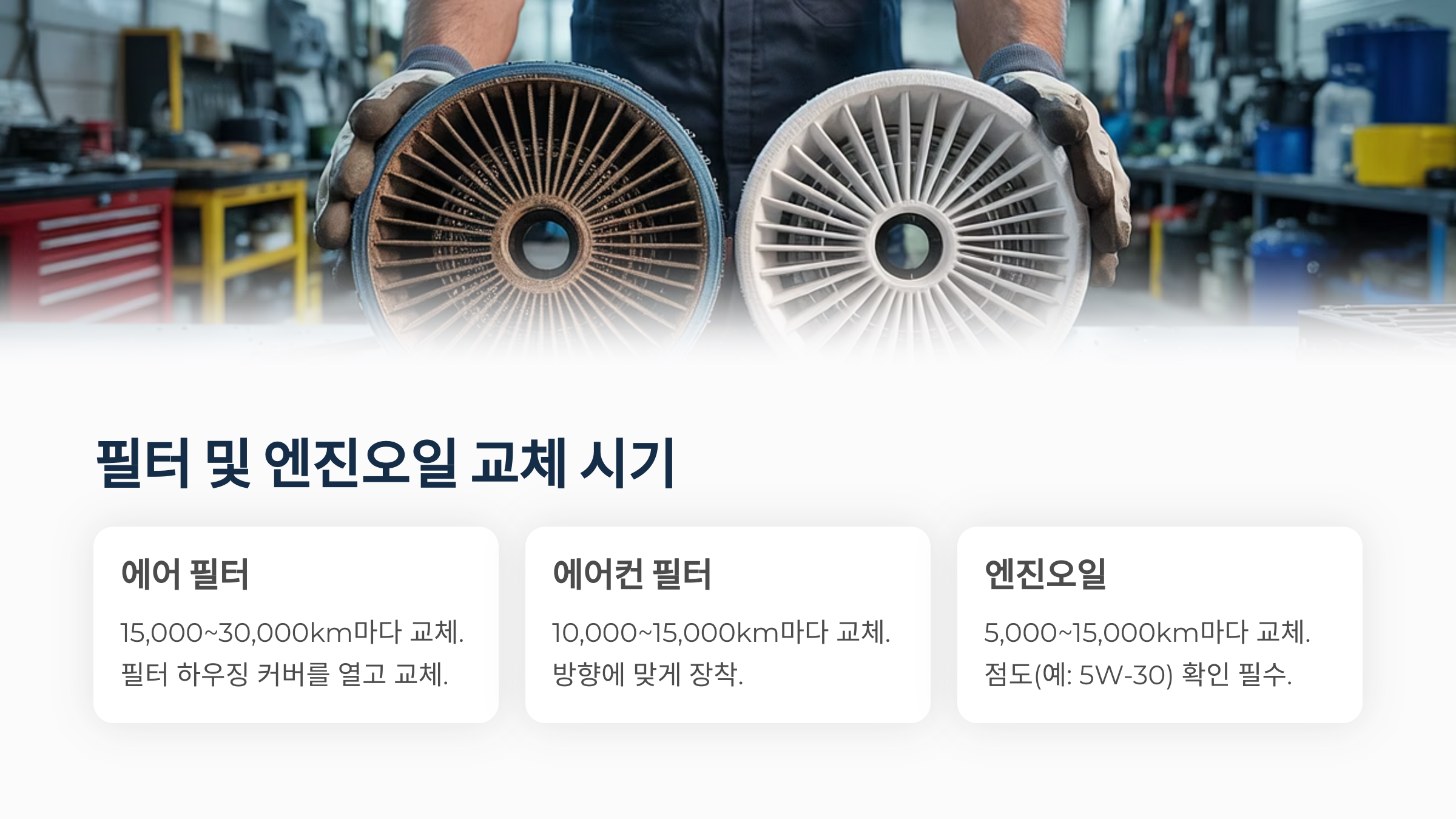에어 필터는 엔진 공기와 실내 공기를 정화하는 중요한 부품입니다. 에어클리너는 15,000~30,000km마다, 에어컨 필터는 10,000~15,000km마다 교체하세요. 필터 하우징 커버를 열고 기존 필터를 제거한 후 새 필터를 방향에 맞게 장착하면 끝!