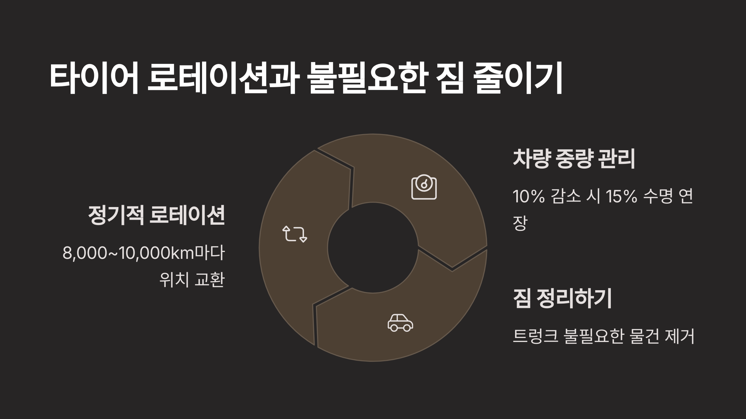 차량에 불필요한 짐을 싣고 다니면 타이어에 과도한 부담이 가해져 마모 속도가 빨라집니다. 트렁크를 정리하고 꼭 필요한 물건만 싣는 습관을 들이세요.